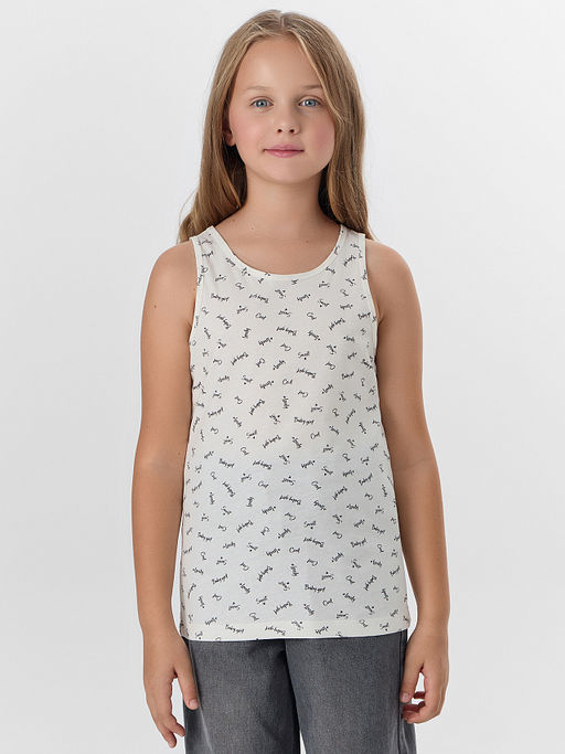 Майка для девочек, выполненная из трикотажной кулирки. Длина до середины бедер. Силуэт полуприлегающий. Горловина круглая. Универсальная майка!­