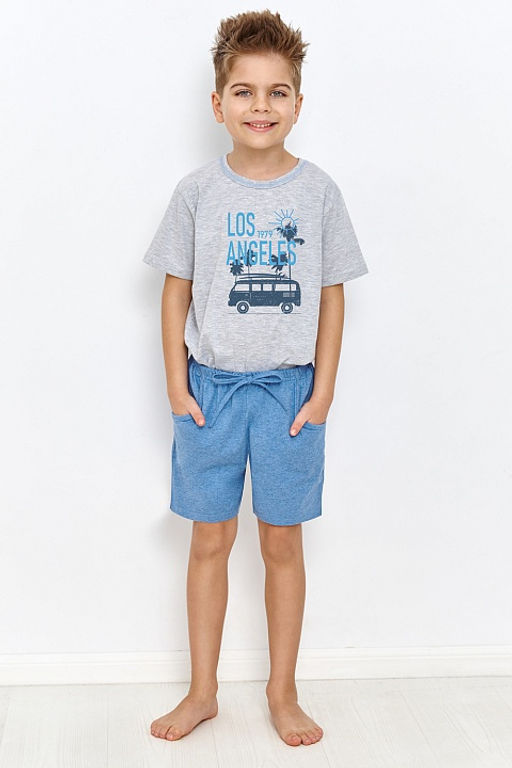 Пижама для мальчиков Zane, состоит из футболки с принтом на груди и однотонных шорт. Футболка свободного кроя с короткими рукавами и круглым вырезом горловины. Шорты на широкой мягкой резинке, по бокам карманы, по ширине регулируются внутренним шнурком. Пижама идеально подходит для сна и в качестве домашнего костюма.­