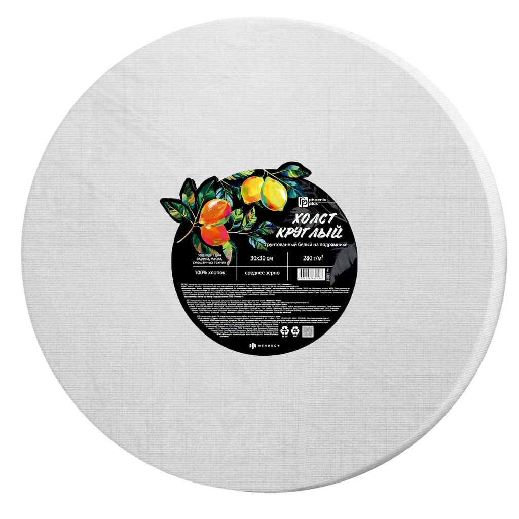 Холст художественный на подрамнике из МДФ, белый, Феникс+ арт. 72839/ 40 ЛИМОНЫ (30х30 см, хлопок 100%, 280г/м2, зерно: среднее, форма: круглая, грунтованный, для акрила, масла, смешанных техник, ПЭТ-плёнка).