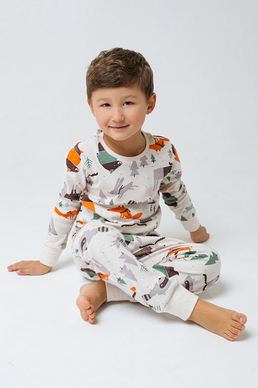 Пижама для мальчика из мягкого трикотажа интерлок пенье. Джемпер и брюки украшены набивным рисунком. На рукавах джемпера - широкие манжеты, низ обработан плоскими швами. В брюках эластичный пояс на резинке и мягкие манжеты.­