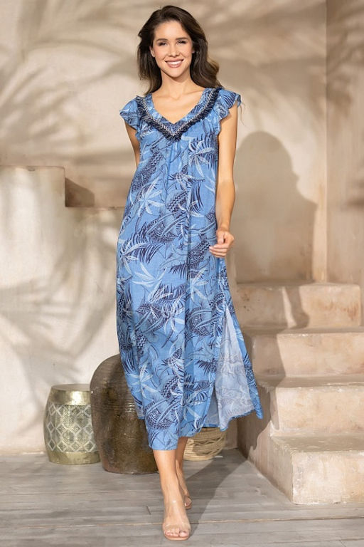 Длинная туника Mia-Amore свободного силуэта с короткими рукавами выполнена из вискозы с цветочным принтом в голубой гамме с этническими мотивами. Горловина туники декорирована бахромой.­