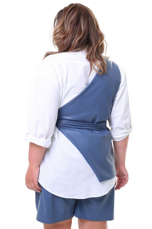 Стильный жилет на одно плечо из мягкой экокожи на вискозной подкладке, хорошо держит форму. Вытачка на груди обеспечивает оптимальную посадку по фигуре. Асимметричный низ визуально стройнит и зрительно вытягивает силуэт. Жилет завязывается сбоку на завязки.   Отлично сочетается с легкими брюками и рубашками в качестве элегантного офисного костюма. Прием многослойности помогает интересно и стильно обыграть базовые вещи.