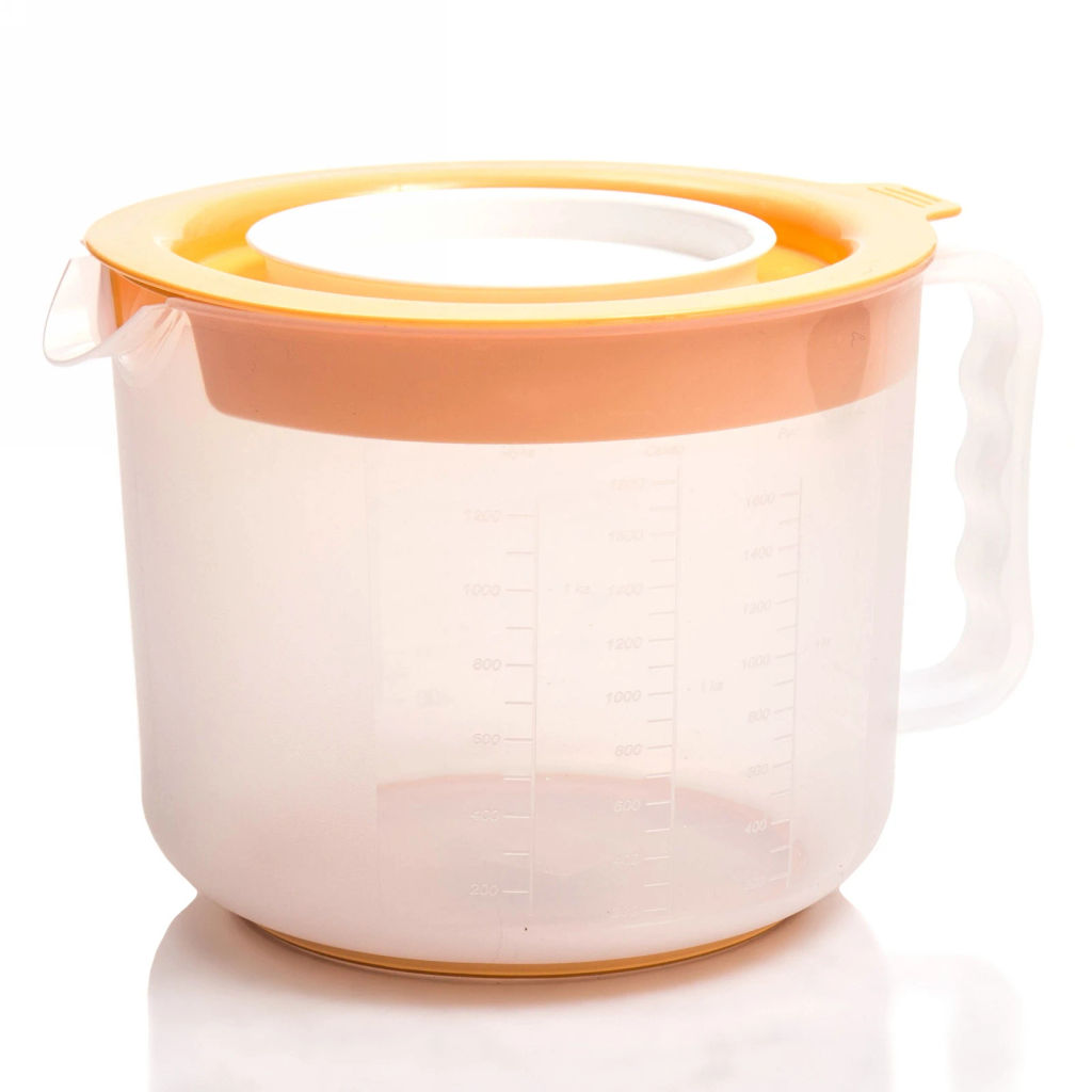 Мерная емкость изготовленная из прозрачного пластика, будет полезна для каждой хозяйки. Наличие мерной шкалы для жидкости и сыпучих продуктов делает емкость максимально удобной. Емкость прекрасно подходит для использования вместе с ручным миксером. Две крышечки - общая и для миксера, плотно прилегают и легко снимаются. Прорезиненная вставка на основании предотвращает скольжение, а гладкая внутренняя поверхность легко моется.­