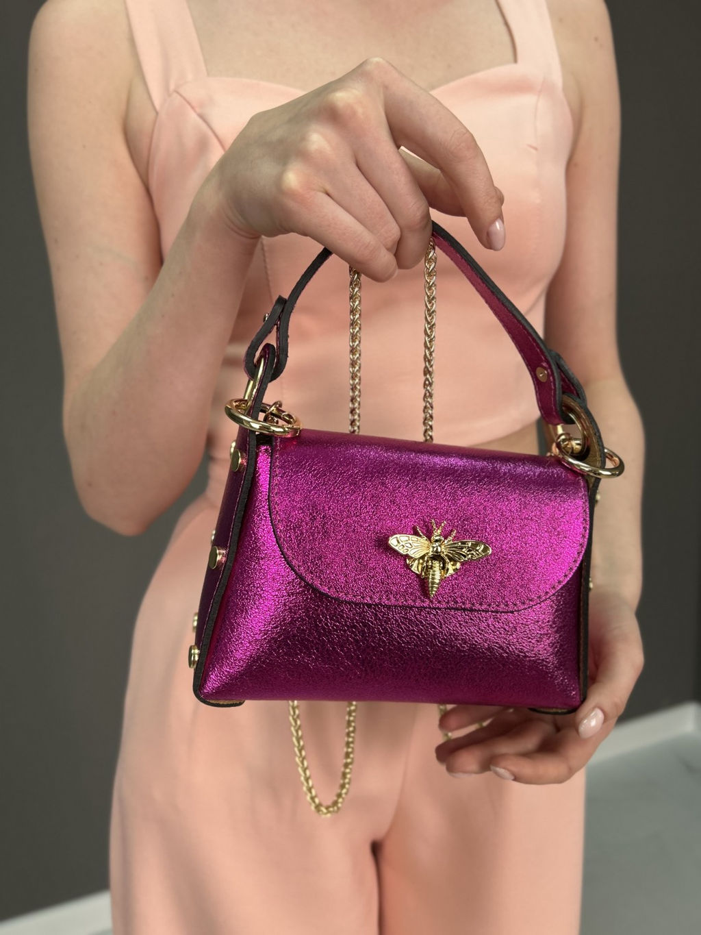 Страна: Италия Производитель: Pelletteria Luisa, Italy Размер: маленькая Стиль ношения: на ремешке через плечо Форма: жесткая Выделка кожи: зернистая износостойкая Цвет кожи: Розовый Оттенок: розовый фуксия металлик Палитра цветов: TB-101028 Размеры: длина: 18 см \tвысота: 12 см \tширина: 6 см \tвысота ручки: 9 см \t Описание: Красивая аккуратная необыкновенно модная женская сумка из натуральной кожи. Базовая коллекция Sefaro, Италия. Главные особенности модели: кросс-боди, замок в виде золотой бабочки, съемный плечевой ремень-цепочка, а также заклепки на боковых стенках сумки - используется фурнитура высокого итальянского качества в золотом цвете. Все эти элементы непременно привлекут к вам внимание окружающих своей яркостью и оригинальностью исполнения. Сумочка имеет каркасную форму, компактная, выполнена из зернистой телячьей кожи надежной и прочной в носке, может использоваться как повседневная модель, но подойдет и для торжественного случая - элегантно дополнит вечерний образ по типу клатча, либо подчеркнет сдержанный деловой, классический или даже винтажный стиль. Закрывается сумка внахлест на элегантную застежку с пряжкой, внутри один отдел, в котором поместится только самое необходимое. На дне сумки металлические защитные ножки. Можно носить в руке, на запястье, либо на изящной цепочке через плечо (длина 120см) - очень удобно!