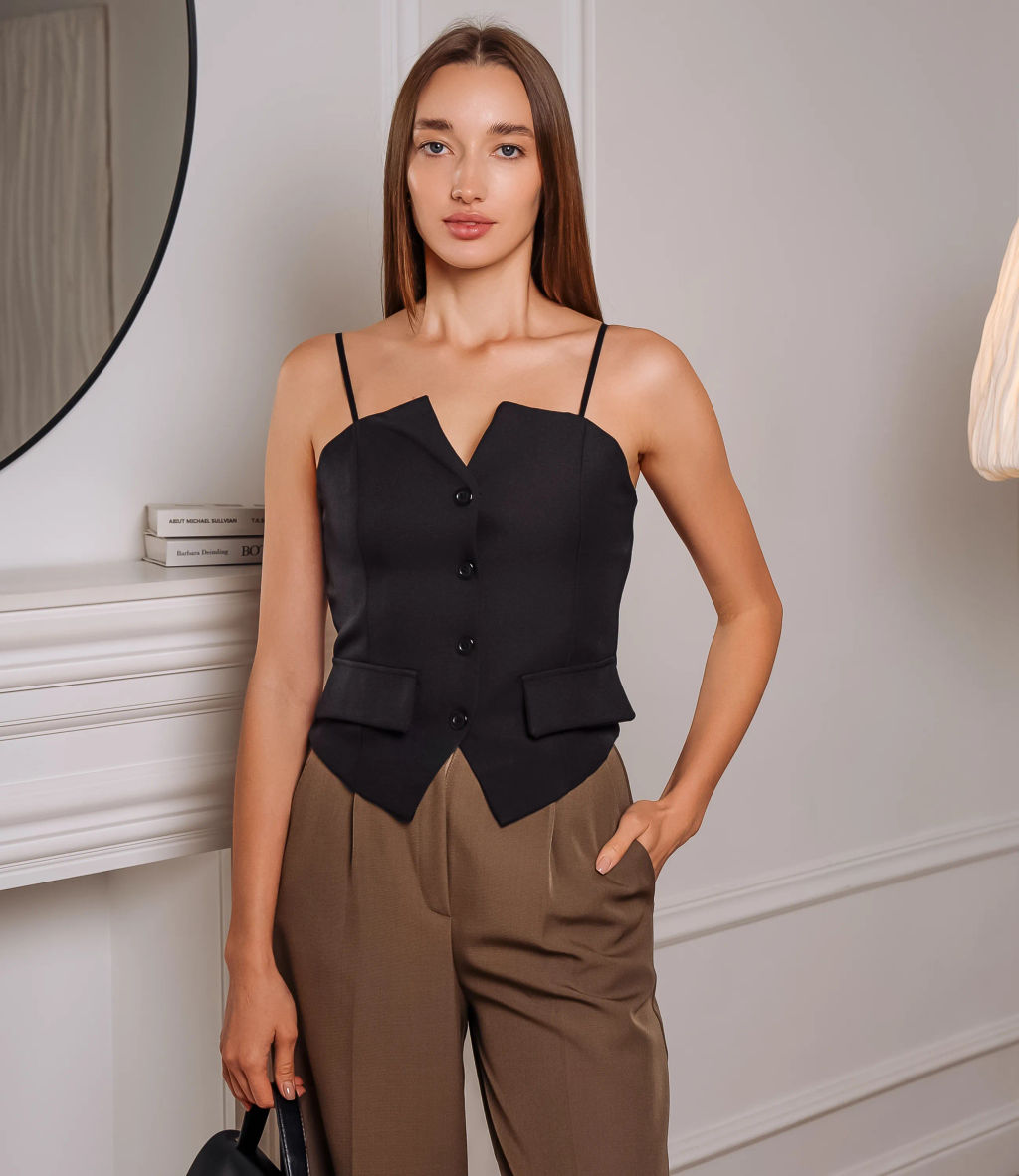 Топ это безрукавная майка с круглым вырезом и уникальной сетчатой фактурой из крупной вязки. Топ приталенного кроя с чёткой конструкцией, повторяющий линии торса и заканчивающийся чуть ниже талии с симметричным V?образным окончанием; верхняя часть имеет аккуратный угловатый вырез по центру и тонкие деликатные бретели, открывающие плечи; по переду расположена центральная планка с рядом пуговиц для застёжки, от которой отстроены вертикальные швы, формирующие стройный силуэт; по линии талии с обеих сторон пришиты небольшие прямоугольные клапаны, имитирующие карманы и визуально подчёркивающие талию; нижний край топа оформлен двумя симметричными клиньями, придающими геометричность линии низа. Состав ткани 65% хлопка и 35% полиэстера обеспечивает не только комфорт, но и долговечность. Хлопок придает майке мягкость, а полиэстер делает ее более устойчивой к деформациям и потере формы после стирок. Даже после многократных стирок майка сохранит свою первоначальную привлекательность и яркость цвета. Обратите внимание на разнообразие доступных цветов, которые полностью соответствуют фотографиям на сайте и позволят вашим клиентам выбрать идеальный вариант, соответствующий их индивидуальности. Мы также подготовили таблицу размеров на странице, чтобы каждая покупательница могла легко и без затруднений подобрать подходящий размер. Предложенная нами цена является привлекательной и адекватной для оптовых покупателей, что позволяет вам расширить ассортимент и привлечь больше клиентов. Дайте вашим покупательницам возможность быть стильными и уверенными в себе с этим великолепным топом! Не упустите шанс предложить им качественную и модную вещь, которая станет настоящим хитом в летнем гардеробе! Рост модели 168 см., 85-63-92. Вы можете заказать онлайн презентацию на интересующие Вас модели. Наши менеджеры свяжутся с Вами и проведут индивидуальную видеотрансляцию, помогут составить заказ и ответят на Ваши вопросы. -- Характеристики -- Цвет: черный Пол: Женский Страна производитель: Китай Сезон: Всесезонный Материал: Хлопок, Полиэстер