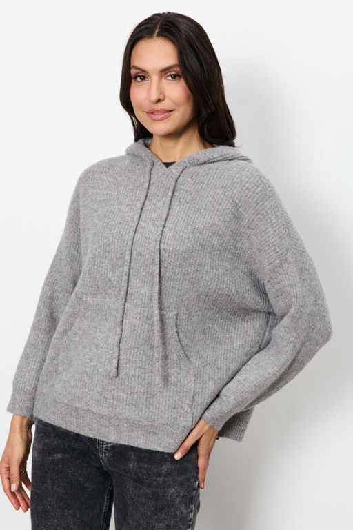 Джемпер свободного кроя с актуальным рубчиком станет основой для множества образов. Капюшон с завязками и вместительный карман-кенгуру это не только практично, но и очень модно. Спущенная линия плеча и длинные рукава подчеркивают непринужденность силуэта. Изделие выполнено из меланжевой пряжи.