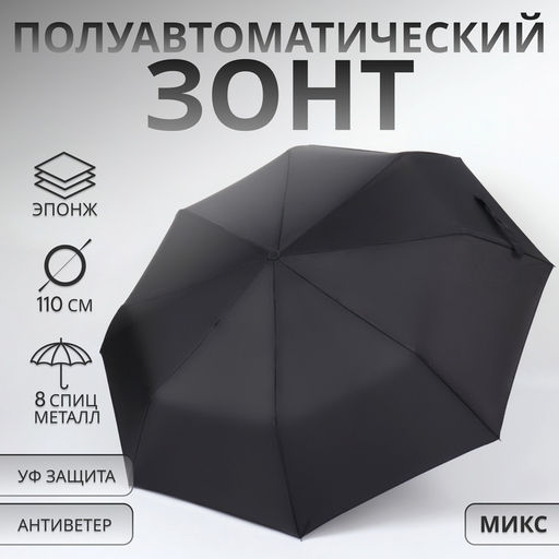 • Зонт полуавтоматический «Гроза», эпонж, 3 сложения, 8 спиц, R=47/55 см, d=94 см, чёрный