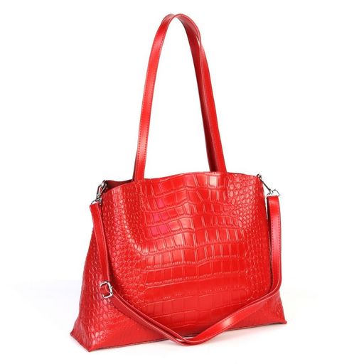 Женская сумка шоппер из натуральной кожи под крокодила красного цвета. Высота ручек 28 см. Сумка закрывается на металлическую молнию. Внутри отделение, разделенное карманом на молнии по середине и боковые кармашки, один на молнии и два открытых. Снаружи, на задней стенке карман на молнии. Вмещает формат А4. В комплекте, съемный регулируемый по длине наплечный ремень, с максимальной длиной 125 см.­