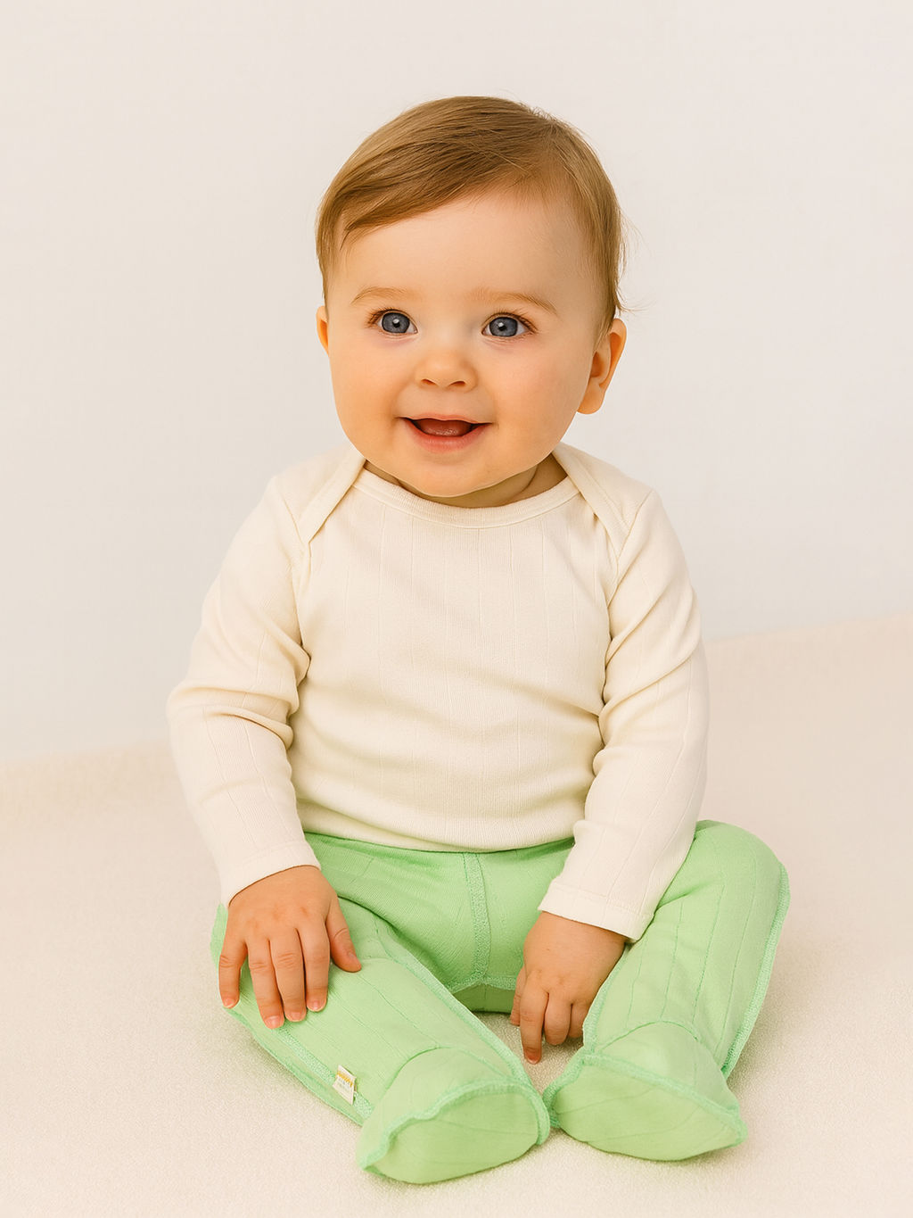 Короткие трикотажные ползунки с закрытой стопой не стеснят активных движений малютки и подарят нежные ощущения во время носки. Изделие выпускается из приятного интерлока салатового цвета: отличной хлопковой материи, гладкой, мягкой и прочной. Ползунки сшиты внешними швами, которые аккуратно оверложены. В поясочек вдета свободная тонкая резиночка, не причиняющая дискомфорта животику малыша.