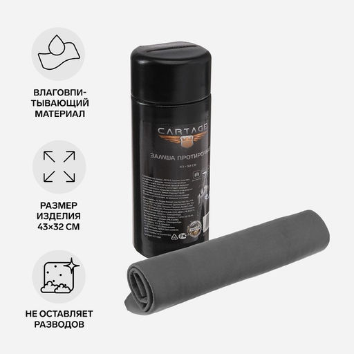 Синтетическая замша Cartage поможет очистить внутренние и внешние элементы автомобиля от пыли и влаги. Мягкий качественный материал быстро впитает жидкость, не оставит разводов на лакокрасочном покрытии и стеклах и не допустит появление царапин. Замша подходит также для бытовых целей и домашнего использования. Хранить и использовать во влажном состоянии. Набор: Нет. Размер, см: 43 х 32. Вид: Замша протирочная. В тубе: Да. Бесплатная доставка: Да. Размеры товара: 6/16.5/5.5.