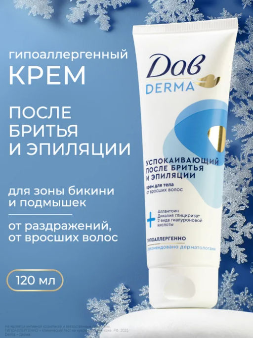 Описание товара Успокаивающий крем Dove для тела после бритья и эпиляции 120 мл: быстрое восстановление кожи, защита от раздражения, комфорт на весь день.