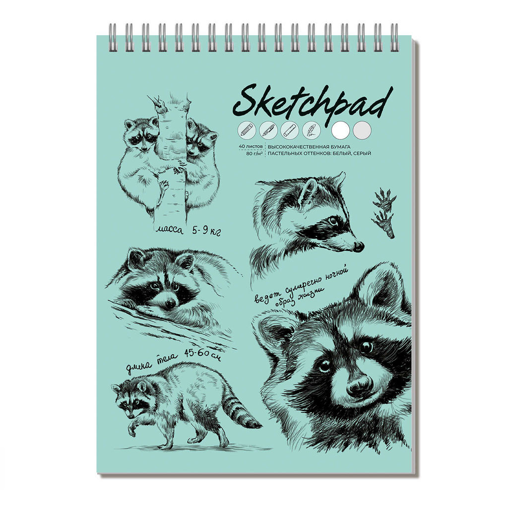 Скетчпад А4 210х290 мм, 40 л, блок - белый офсет, серый офсет 80 г/м?, арт. 62768 ЕНОТ-ПОЛОСКУН /обложка полноцветная печать, твёрдый переплёт, гребень по короткой стороне, матовая ламинация,