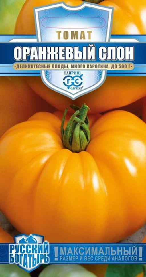 Томат оранжевый слон неприхотлив, способен приживаться в разных климатических условиях и дает большой полезный урожай. Сорт среднеспелый (110120 дней от всходов до плодоношения), для выращивания в пленочных теплицах и открытом грунте (в южных регионах) с подвязкой к кольям. Растение детерминантное (с ограниченным ростом), высотой 70100 см. Плоды плоскоокруглые, ярко-оранжевые, средней массой 250300 г (отдельные до 500 г!). Мякоть нежная, с приятным сладковатым вкусом, содержит много каротина. Используют для приготовления свежих летних салатов, соков и томатных соусов. В сочетании с другими сортами крупноплодных томатов получаются очень яркие и вкусные овощные нарезки. Посев на рассаду в конце мартаначале апреля. Пикировка в фазе первого настоящего листа. Высадка в грунт в конце маяначале июня. Подвязка, регулярные подкормки, сбор плодов в бланжевой спелости с последующим дозариванием увеличивает выход урожая. Семена после уборки сохраняют всхожесть в течение 10 лет при оптимальных условиях хранения