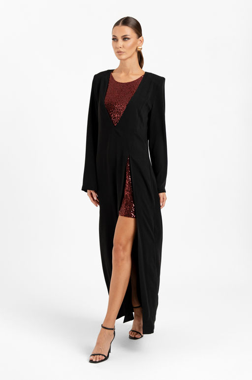 Комплект женский двухпредметный. Платье без рукавов из ткани с пайетками на трикотажной подкладке. Вырез горловины - неглубокий округлой формы. Туника - свободного покроя из плательной ткани. Вырез горловины - V-образной формы, углубленный. Спереди слева - высокий разрез. Рукава - втачные с плечевыми накладками.