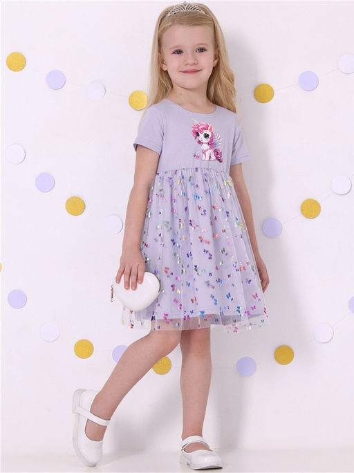 платье,хлопок 90% + лайкра 8% + пэ 2%,кулир с лайкрой / хлопок 90% + лайкра 8% + пэ 2%,- / светло-сиреневый248+разноцветные бабочки на белом / Кудрявый единорог / - / - / -,Платье из легкокого хлопкового полотна с лайкрой. Изделие полуприлегающего силуэта, с отрезной юбкой по линии талии, с круглым вырезом горловины и короткими рукавами. Юбка двуслойная из кулира с лайкрой и магкой сетки. На полочке выполнена печать. Уход: только деликатная стирка при температуре 40 градусов, без предварительного замачивания.