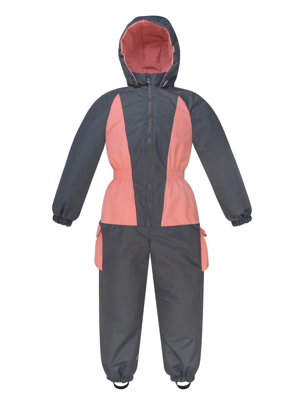 Детский демисезонный мембранный комбинезон полуприлегающего силуэта с несъемным капюшоном. Подкладка в капюшоне из основного материала персикового цвета, регулируется шнуром-резинкой и фиксаторами. Высокий воротник с защитным клапаном от бегунка. Прямая молния с внутренней ветрозащитной планкой. Подкладка основной части кулирка, в рукавах и штанинах таффета. Утеплитель – тинсулейн 100гр/м2. Манжеты с резинками. В рукавах внутренняя часть манжет обработана кулиркой. По низу одной штанины - светоотражающая полоса. Для дополнительной фиксации штанин предусмотрены несъемные штрипки. По бокам на бедрах накладные карманы контрастного цвета с клапанами со светоотражающей окантовкой. В области талии резинка для лучшего прилегания. Комбинезон в интересном дизайне. Подходит для осени и весны для температуры до -5.
