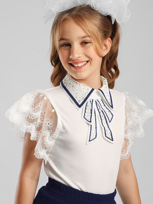Блузка для девочки Соль&Перец. Передняя часть декорирована кружевом, отложной воротник выполнен из кружева, рукава-крылышки выполнены из лёгкого фатина. Мягкий, приятный к телу материал в рубчик, обеспечит идеальную посадку изделия по фигуре. Блузка прекрасно сочетается как с брюками, так и с юбкой, подчеркнёт индивидуальный стиль девочки, и разнообразит её повседневный школьный образ.