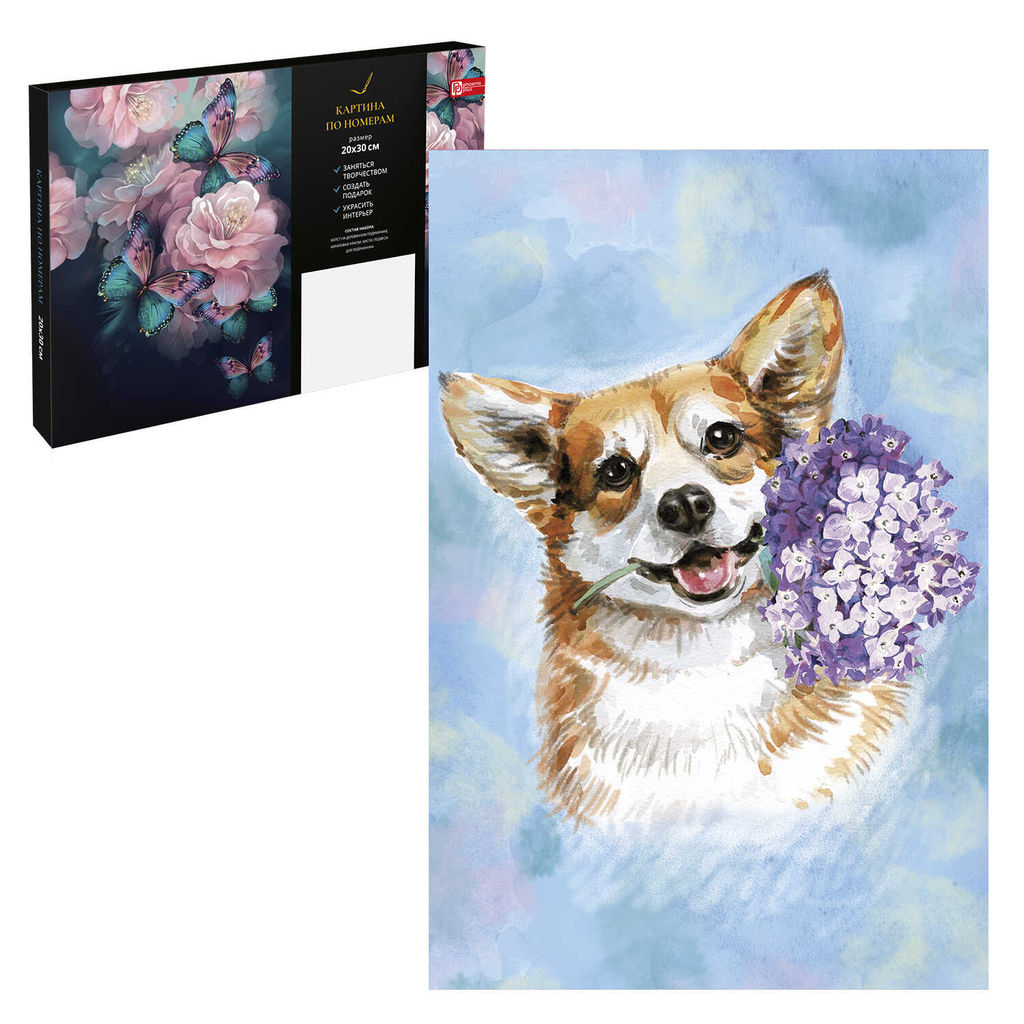 Набор для творчества Картина по номерам арт. 67918 / 40 КОРГИ С СИРЕНЬЮ, размер: 20х30 см, (15 цвета (-ов), холст на деревянном подрамнике с напечатанной схемой рисунка, контрольный лист с нанесенной схемой, краски акриловые на водной основе (упакованы в вакуумную упаковку), кисти художественные с ворсом из нейлона 4 шт., подвесы для подрамника, пакет на zip-молнии, лак в комплекте, картонная коробка)
