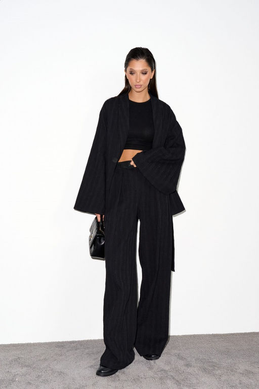 Комплект состоит из жакета и брюк выполнен из фактурного полотна черного цвета.