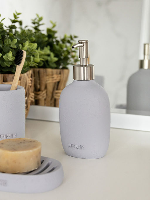 Диспенсер для жидкого мыла DeNASTIA 370 мл, Лофт, полирезина, серый. Диспенсер для жидкого мыла впишется практически в любой современный интерьер. Мыло подаётся из него порционно, легким нажатием на дозатор. Диспенсер выполнен из полирезины, это прочный и долговечный полимерный материал, идеально подходит для мест с высокой влажностью. Если для Вас важны необычный дизайн и гигиена, то изделия из полирезина это то, что Вам нужно. Дозатор для жидкого мыла можно приобрести вместе с другими аксессуарами для ванной комнаты, собрав единый по цвету и стилю комплект (стакан для зубных щеток, мыльница, ершик для туалетной комнаты с чашей).