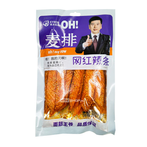 Пряные снеки латяо Maipai Mianjinwangye Kyron пикантная китайская закуска с мягкой, тягучей и жевательной консистенцией. Китайские латяо делают из теста на пшеничной муке. Снеки сдабривают острым чили-маслом, солью, кунжутом, жгучим перцем и богатым набором специй. Пряные ломтики отличаются высоким уровнем остроты и богатым сложным вкусом. Сочетание вкуса и необычной жевательной текстуры покорило снекоманов, и вот уже 30 лет в Поднебесной латяо знатно потеснили чипсы, сухарики и орешки на полках супермаркетов. Количество фанатов этой закуски по всему миру растет с каждым годом. Латяо выпускаются с самыми разными оттенками вкусов, которые им придают интересные комбинации специй, разработанные производителями.
