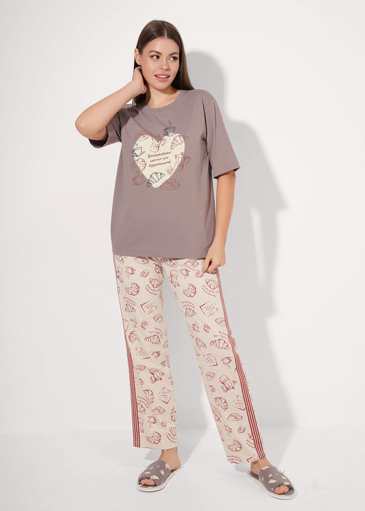 Набор одежды для дома и отдыха из хлопкового трикотажного полотна. Футболка прямого кроя. Короткий втачной рукав. Округлая горловина с обтачкой. Спереди принт. Брюки с поясом на внутренней резинке, по боковому шву -лампас из тесьмы, спереди нашивка. 100% Хлопок