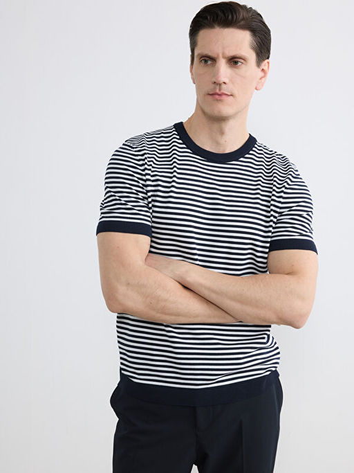 Bisiklet Yaka ?izgili K?sa Kollu Erkek Triko Kazak