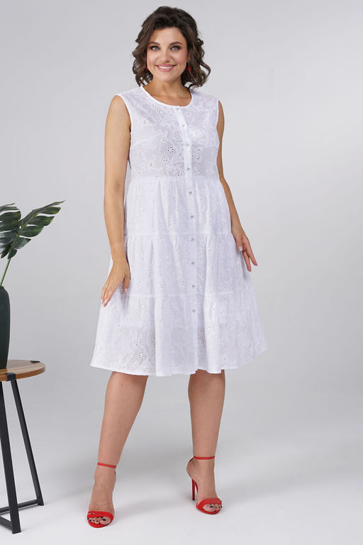 Платье  верхняя  часть полуприлегающего силуэта, нижняя из трёх воланов собранных на сборку и на подкладке, с застёжкой по плаке на петли, пуговицы, чуть спущенное плечо. Перед с нагрудными выточками. Спинка с талевыми выточками.­