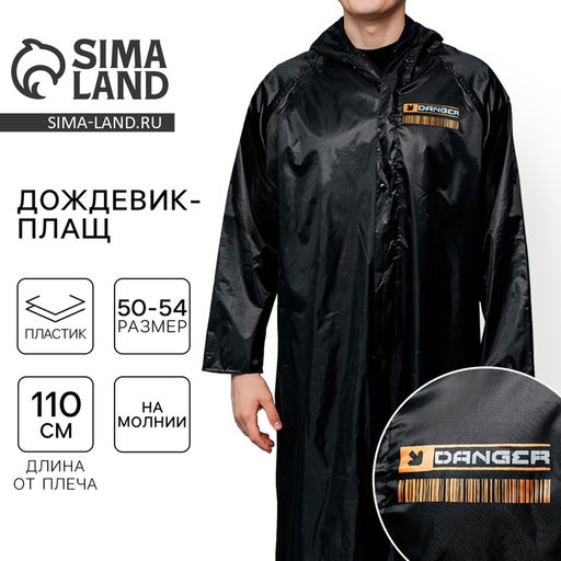 Дождевик взрослый мужской плащ DANGER, на молнии, размер 50-54, цвет чёрный