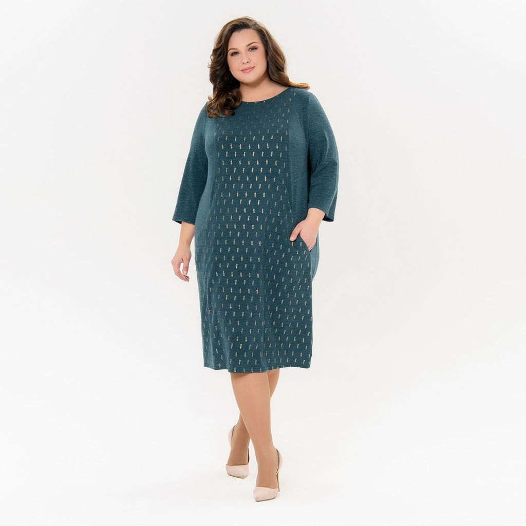 Платье прямого силуэта из искусственной ангоры. Центральная часть переда платья с мерцающим напылением цвета золота, отрезные бочки, спинка и рукава из ткани-компаньона. В рельефных швах обработаны карманы. Рукав двухшовный, длиной 3/4.