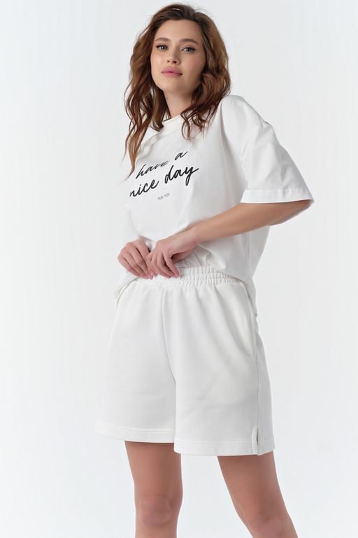 Особенности: Прямые шорты из футера. Детали: притачной пояс с резиной, боковые карманы, невысокие разрезы в боковых швах.