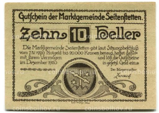 • Банкнота 10 геллеров 1920 года Австрия Нотгельд  Зайтенштеттен