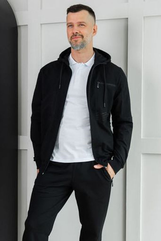 Верх — толстовка на молнии с капюшоном. Два боковых кармана и один нагрудный карман на молнии— функциональная деталь, идеально подходящая для хранения мелочей или документов. Рукава и низ изделия оформлены манжетами, обеспечивающими плотную посадку и защищающими от продувания.