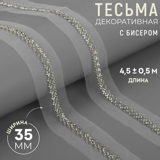 • Тесьма декоративная с бисером, 35 мм, 4.5±0.5 м, белая