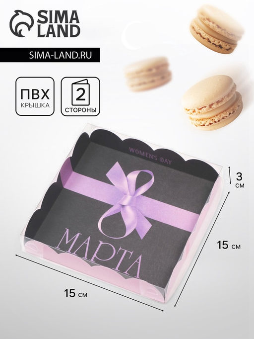 Коробка для печенья с прозрачной крышкой. Прекрасно подойдет для десертов, можно использовать для праздничного декора.Преимущества:- плотный картон;- сборная конструкция;- удобно при транспортировке. Вид упаковки: Для печенья. Форма: Квадратная. Плотность, г/м?: 260. Длина, см: 15. Ширина, см: 15. Высота, см: 3. Тематика: Праздник. Тематика: Женская. Тематика праздника: 8 Марта. Наша разработка: Да. Размеры товара: 15/3/15.