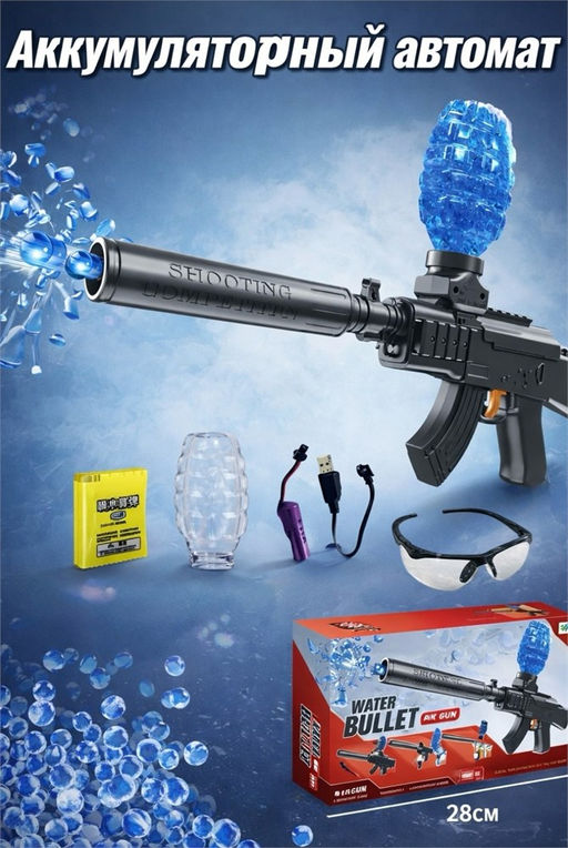 • Стреляющ. гидропулями аккумул. 43*24см автомат "АК черный" (918) с глушителем; 500 пулек, USB зарядка и очки, в коробке