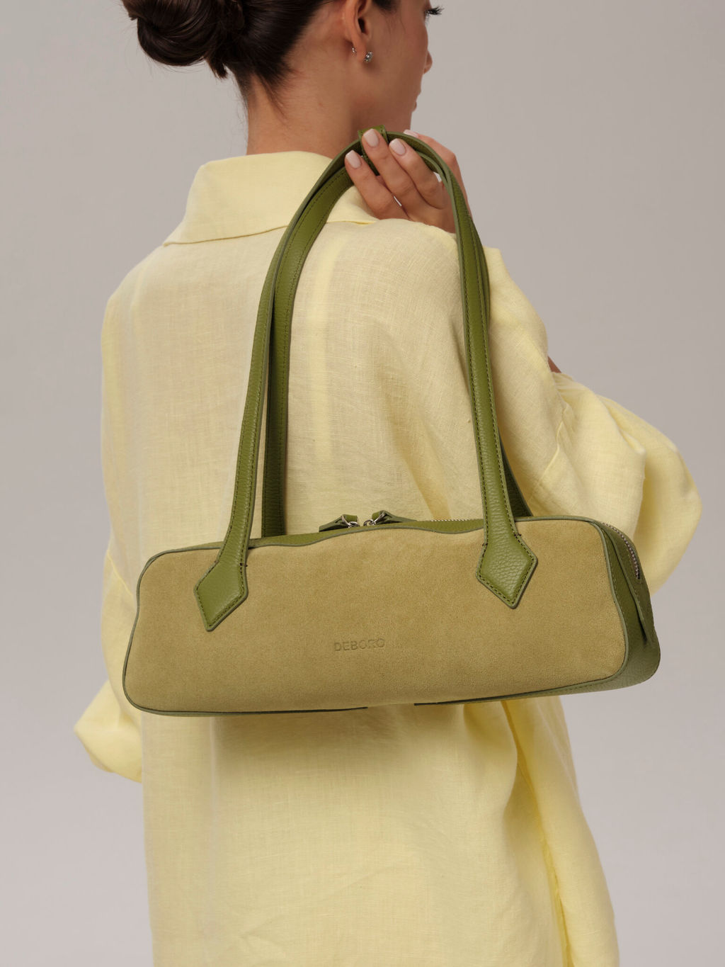 Женская замшевая сумка багет Deboro 31129 зеленый бамбук. Вытянутая, аккуратная, с мягко скругленными краями форма отлично смотрится как в повседневных образах, так и в более элегантных сочетаниях. Сумка изготовлена из натуральной замши со вставками из гладкой кожи, обладает полужестким каркасом, что придает ей элегантный и стильный вид. Высококачественная металлическая фурнитура серебряного оттенка гармонично сочетается с цветом кожи. Внутри сумки расположено одно просторное отделение с карманом на молнии для телефона и мелочей. Удобные ручки соединяются стяжкой на кнопке. Они позволяют носить сумку на плече или в руках. На передней стенке сумки снизу лаконично расположено тиснение DEBORO, добавляющее художественный акцент. Это идеальная женская сумка для любой ситуации, сочетающая в себе стиль, качественные материалы и функциональность. -- Характеристики -- Тип товара: Женские сумки Цвет: зеленый бамбук Материал: Натуральная кожа;Замша натуральная Бренд: Deboro Страна-изготовитель: Россия Высота, см: 16 Ширина, см: 37 Глубина, см: 10 Материал подкладки: Хлопок Количество внутренних отделений: 1 Тип застежки: Молния Формат А4: не вмещает Высота ручек, см: 28 Вес товара, г: 385 Ручки: На запястье;На локоть;На плечо;Плечевой ремень Пол: женская коллекция Группа товара: Сумки Выгружать товары на сайт: Да Количество внутренних карманов, шт: 1