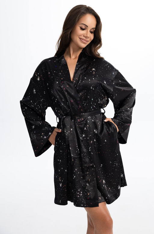 Короткий запашной халат Mia-Amore с длинными рукавами выполнен из принтованного искусственного шёлка. Халат комплектуется широким поясом, в боковых швах карманы. Состав:100% полиэстер