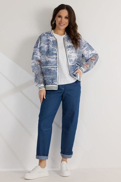 Состав: Бомбер: ПЭ-100%; Брюки: ПЭ-25%; Хлопок-70%; Эластан-5%; Футболка: Хлопок-95%; Эластан-5%; Стильный комплект из бомбера, футболки и брюк. Бомбер свободного кроя с центральной застежкой на стильную молнию. Выполнен из полупрозрачной органзы с джинсовым принтом. Горловина, низ бомбера и манжеты выполнены из притачного довяза. Бомбер дополнен боковыми карманами. Футболка прямого кроя. Рукав спущен. Выполнена из хлопкового трикотажного полотна. Брюки свободного кроя, слегка заужены книзу. Посадка средняя. Пояс притачной, дополнен эластичной тесьмой. Брюки дополнены удобными боковыми и задними карманами. Застежка гульфик на молнию и металлическую пуговицу. Выполнены из джинсовой ткани. Длина бомбера от плечевого шва 64см. Длина рукава 60см. Длина футболки от плечевого шва60см. Длина брюк по боковому шву 96см. -- Характеристики -- Состав: Бомбер- ПЭ-100%; Брюки- ПЭ-25%; Хлопок-70%; Эластан-5%; Футболка- Хлопок-95%; Эластан-5%; Сезон: Весна Рост: 164 Страна бренда: Беларусь