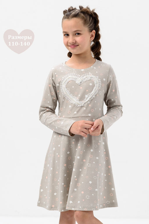 Платье для девочки в садик трикотажное с длинным рукавом, расклешенное от линии талии, спереди на верхней нашито кружево в виде сердца прилегающего силуэта, отрезное и расклешенное от линии талии. Сшито из мягкого трикотажного полотна с рисунком с добавлением в состав хлопка 92% и лайкры 8 %. Идеально для детского сада, для прогулок, для праздника и на каждый день, обладает прочностью, которая позволяет Вашей девочке активно играть и веселиться, не ограничивая движения. Прекрасная посадка позволяет использовать, как повседневное, а ещё наше платье для девочки не имеет застежек, что делает его легким в надевании и снятии, ребёнок сможет самостоятельно одеваться и чувствовать себя самой красивой принцессой. В нашей одежде не будет жарко в период включенного отопления осенью, весной и зимой.