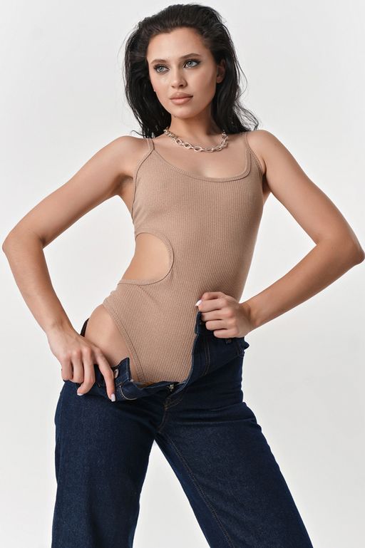 Особенности: Боди из трикотажа в рубчик с люрексом. Детали: глубокий вырез по переду и спинке, тонкие бретели, фигурный вырез по правому боку. Без застежки.