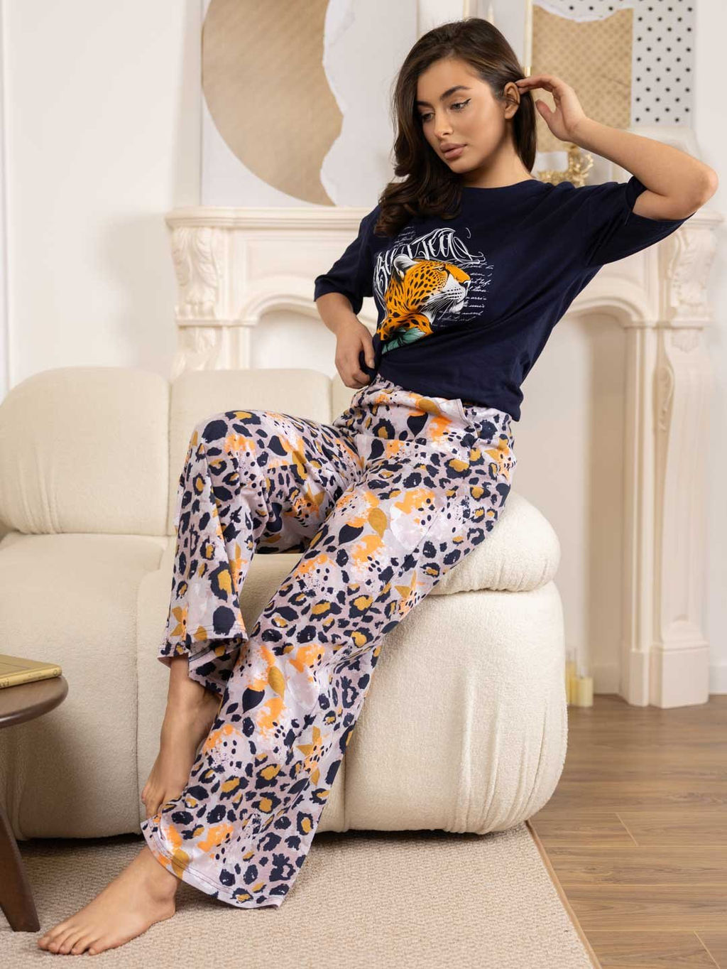 Домашний костюм из хлопка идеально подойдет для дома. Комплект состоит из брюк и футболки. Широкие брюки с карманами на эластичном поясе. Футболка со спущенной линией плеча и свободным силуэтом обеспечит комфорт во время отдыха, спереди и сзади нанесен принт. Рост модели 165см.­