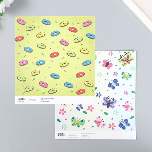 • Цена за 10 шт. Бумага для скрапбукинга двусторонняя Бабочки и пончики, плотность 180 г, 15.5?17 см