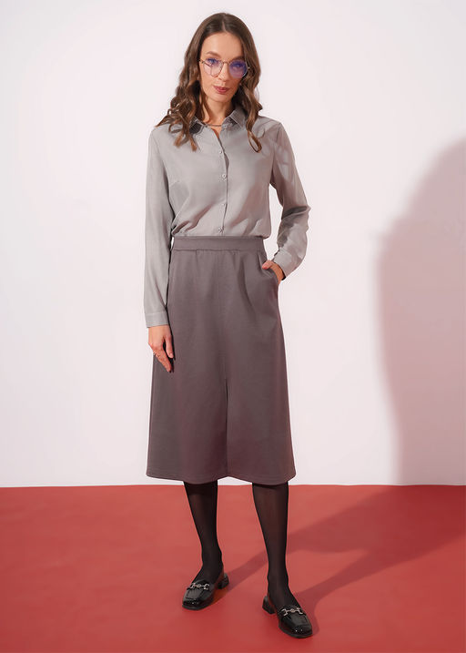 Юбка из трикотажного полотна джинс-трикотаж, А-образного силуэта длиной миди. По талии притачной пояс на внутренней резинке. Спереди средний шов с разрезом. Боковые карманы с отрезным бочком. По спинке средний шов, вытачки. По низу потайная строчка. 85%ПЭ10%Хлопок 5%ПУ(эластан)