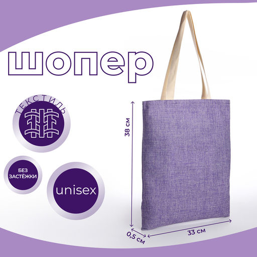 • Сумка - шоппер, без застёжки, однотонная, 33×0.5×38 см, сиреневая