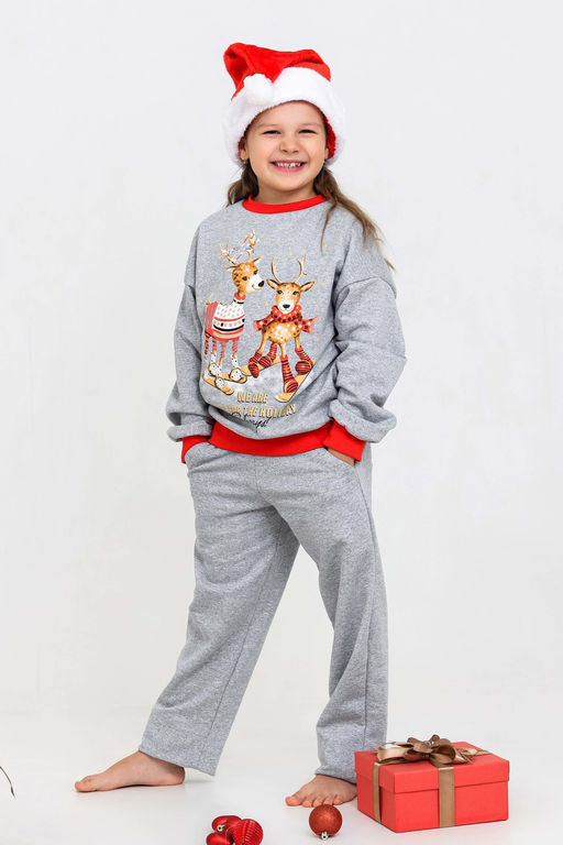 Костюм домашний для детей, подходит как для девочек, так и для мальчиков. На свободном свитшоте изображены весёлые олени, что создаёт атмосферу праздника. Брюки прямые, с боковыми карманами. Манжеты выполнены из плотной резинки - рибаны с лайкрой. Пояс на широкой резинке. Материал приятный к телу. В таком костюме можно встретить праздник, использовать в качестве подарка на Новый год или Рождество. А также в нём можно находиться в домашней обстановке для создания хорошего настроения.