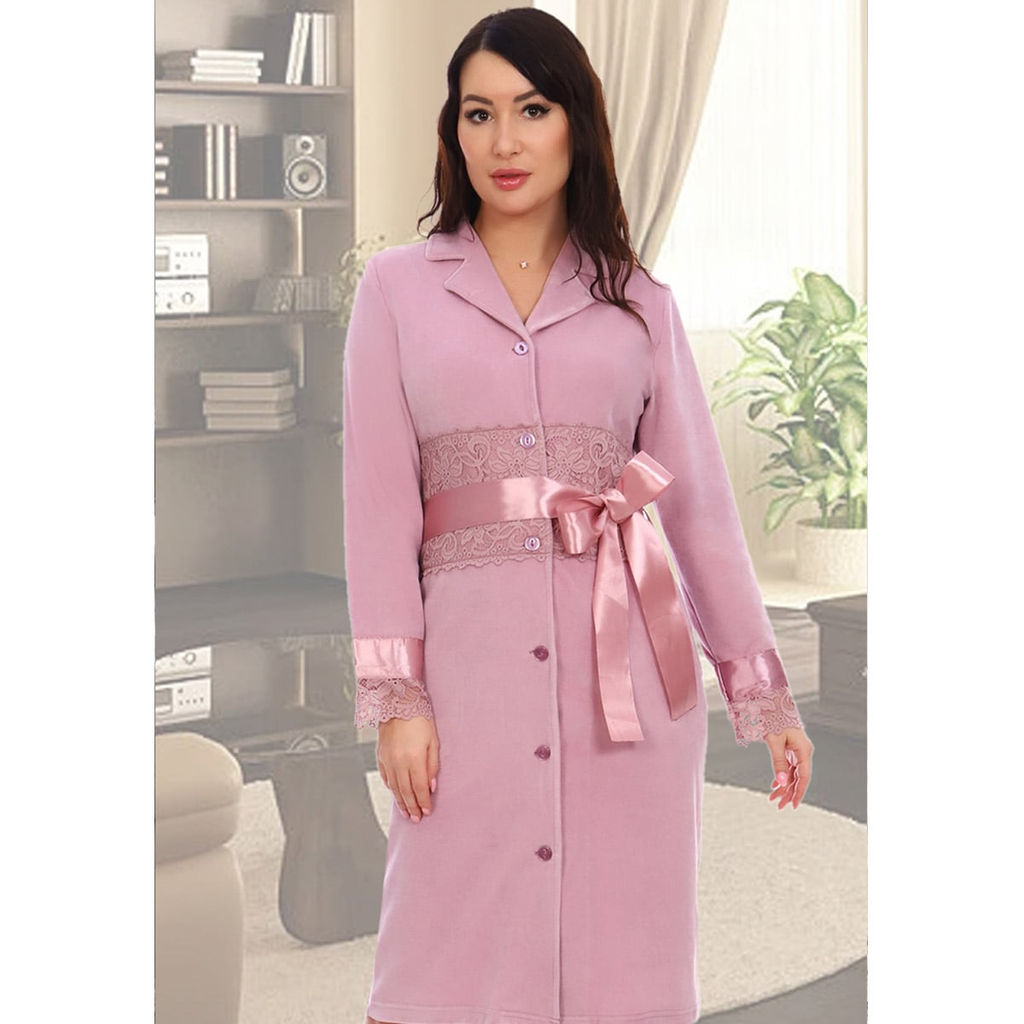 Домашний женский халат из мягкого, приятного к телу велюра, декорирован изящным кружевом и атласной лентой. Несомненно приятно, выйдя из душа или ванной, завернуться в тёплый, мягкий, пушистый халат, и присев в любимое кресло с чашечкой горячего ароматного чая, расслабиться после тяжёлого трудового дня. Нежный и уютный халат - неотъемлемая часть гардероба практически любой женщины, которая стремится выглядеть очаровательно в независимости от того, где она находится.