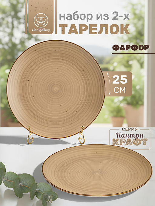 Набор 2 тарелок из серии Кантри Крафт от Elan Gallery предназначен для эстетичной сервировки вашего стола. Размер каждого изделия 25,5х25,5х2,8 см. Выполнены из высококачественного фарфора. Он легко отмывается и не впитывает цвет продуктов, благодаря чему надолго сохраняет свой внешний вид. Тарелки песочного цвета украшены тёмным спиральным узором, мелкой крапинкой и окантовкой. Они подойдут для подачи рыбных и мясных блюд, а также разнообразных закусок. Красиво подавайте на них курицу, рыбу или любое другое мясо. Используйте для сервировки салатов, сырной нарезки, овощей и фруктов, чтобы угостить большое количество гостей. На сервировочных блюдах удобно разместить кусочки пирога или торта, конфеты, зефир, а также другие десерты и сладости. Подойдут для красивой подачи суши, роллов или бутербродов на завтрак. Не рекомендуется применять абразивные моющие средства. Подходят для использования в посудомоечной машине и микроволновой печи. Поставляются в дизайнерской картонной коробке благодаря ей вам не потребуется дополнительная подарочная упаковка. Фарфоровая сервировочная посуда будет оригинальным подарком для хозяйки, ценящей не только практичность, но и привлекательность. Серия Кантри Крафт от бренда Элан Галерея это воплощения природной эстетики и атмосферы загородного уюта!