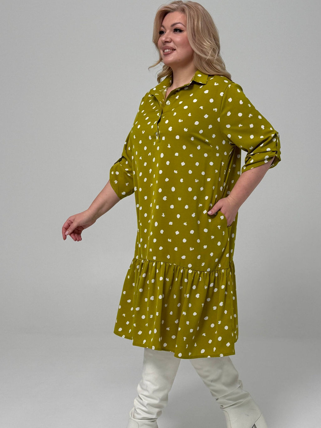 Платье-рубашка с рисунками и воланом к низу оливковое­