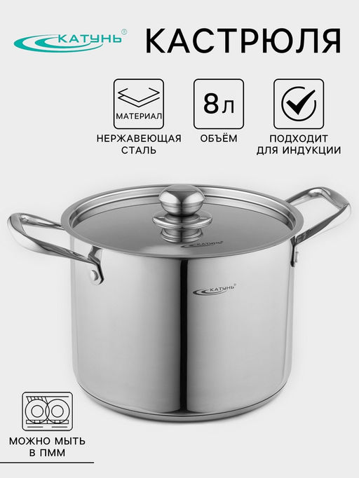 Кастрюля из нержавеющей стали необходимый атрибут любой профессиональной кухни. Достоинства изделия: Благодаря низкой теплопроводности металла приготовленное блюдо долго остаётся горячим. Полировка придаёт посуде эффектный вид. Конструкция дна обеспечивает быстрый и равномерный прогрев пищи.Правила ухода за изделием: Не применяйте абразивные инструменты и сильнохлорированные моющие средства. Не оставляйте пустую посуду на горячей плите. Во избежание образования белых пятен солите воду после закипания. Подходит для газовых и электрических плит. Больше посуды, пригодной для использования в детских садах по ссылке. Диаметр, см: 24. Объём, л: 8. Рисунок: Нет. Крышка: Да. Тип покрытия: Без покрытия. Тип плиты: Для газовой плиты. Тип плиты: Для индукционной плиты. Тип плиты: Для электрической плиты. Тип плиты: Для стеклокерамической плиты. Капсульное дно: Да. Можно мыть в посудомоечной машине: Да. Серия: Катунь Титан. Примечание: В наименовании указан полный объём с замером до края.Полезный объём будет отличаться в меньшую сторону от указанного..
